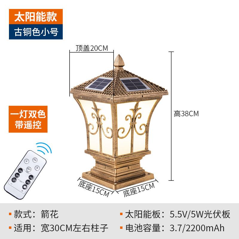 产地:中山古镇|是否进口:否|认证:无|连续照明时间:6小时(含)-12小时(不含)|货号:BLW-TYD|风格:欧式|品牌:宝莱沃|型号:BLW-TYD|订货号:BLW-TYD|加工定制:是|类型:柱头灯|材质:压铸铝|防护等级:lp65|外形尺寸:小号剑花加厚太阳能款古铜-三色+遥控,中号剑花加厚太阳能款古铜-三色+遥控,大号剑花加厚太阳能款古铜-三色+遥控,小号剑花加厚太阳能款黑色-三色+遥控,中号剑花加厚太阳能款黑色-三色+遥控,大号剑花加厚太阳能款黑色-三色+遥控,小号剑花加厚款接线古铜-送7瓦灯泡,中号剑花加厚款接线古铜-送10瓦灯泡,大号剑花加厚款接线古铜-送15瓦灯泡,小号剑花加厚款接线黑色-送7瓦灯泡,中号剑花加厚款接线黑色-送10瓦灯泡,大号剑花加厚款接线黑色-送15瓦灯泡|光源类型:太阳能柱头灯|光源功率:5|电压:3.7|主要适用范围:公园 庭院 别墅 小区|是否跨境出口专供货源:否|是否一般纳税人:是|是否有专利:否