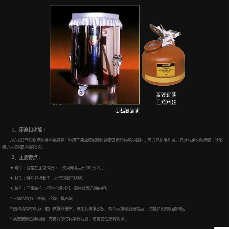 品牌:天恒博达|总高:750mm|重量:150kg|抗爆能力:1.5kg当量|产地:河北|是否进口:否|外形尺寸:56×80.8cm|名称:安检排爆排爆设备|不锈钢防爆罐:13521458581|可售卖地:北京;天津;河北;山西;内蒙古;辽宁;吉林;黑龙江;上海;江苏;浙江;安徽;福建;江西;山东;河南;湖北;湖南;广东;广西;海南;重庆;四川;贵州;云南;西藏;陕西;甘肃;青海;宁夏;新疆|材质:高碳钢