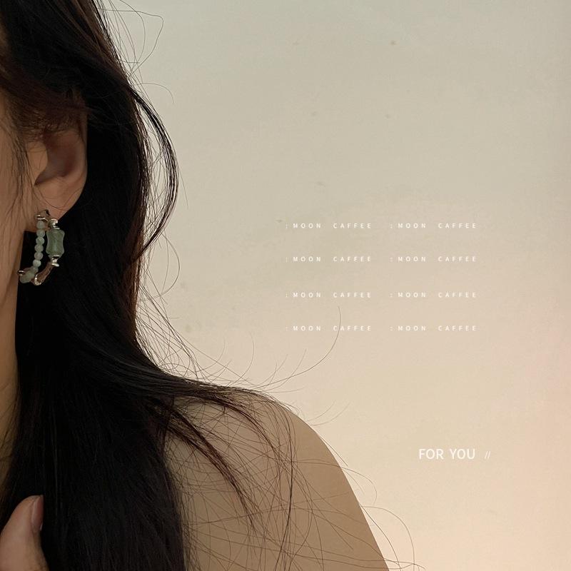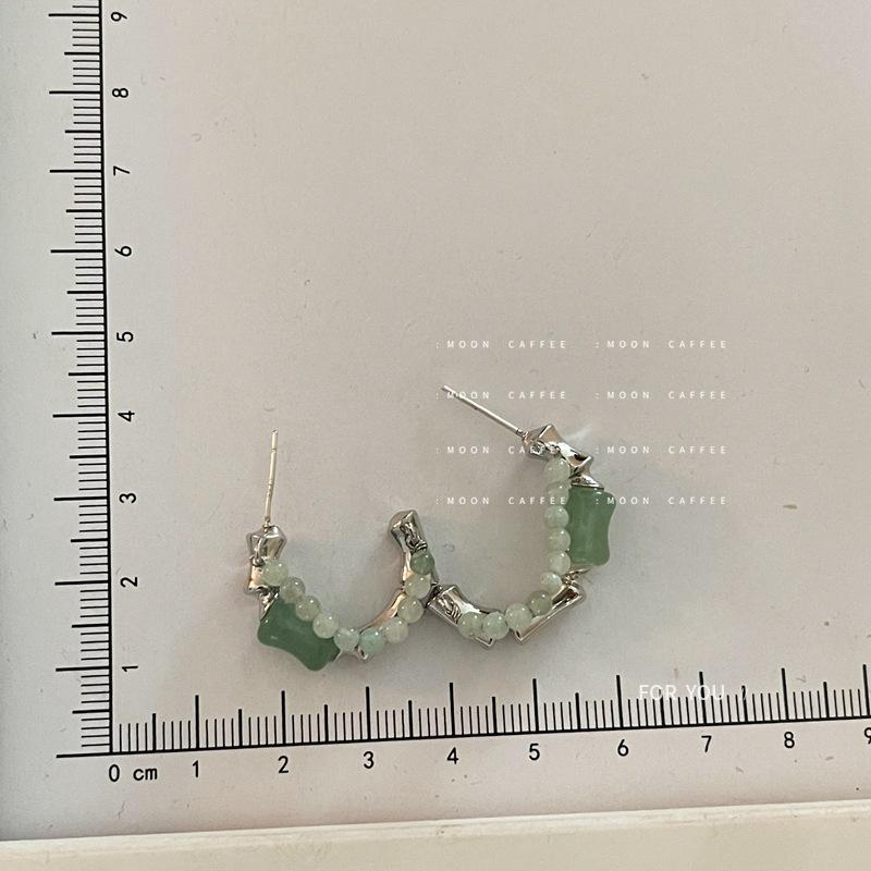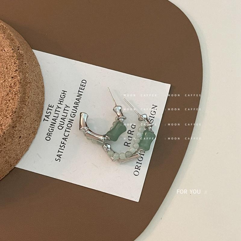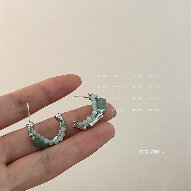925银针新中式玉髓石串珠C型耳环简约复古时尚竹节造型耳钉耳饰女 |