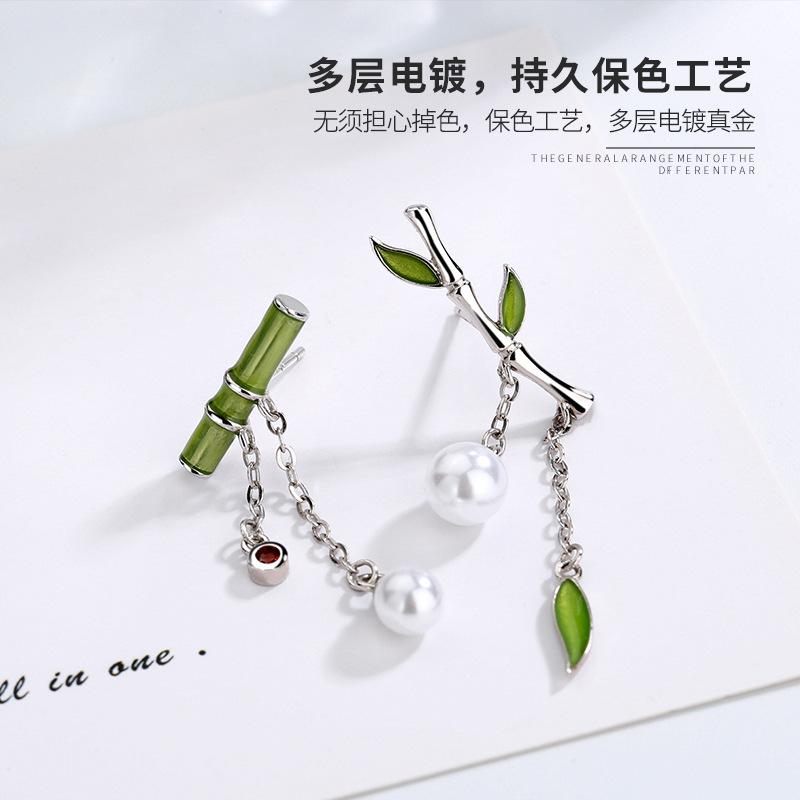 新款通体s925银耳钉女生竹童珍珠耳环复古中国风不对称小清新耳饰 |