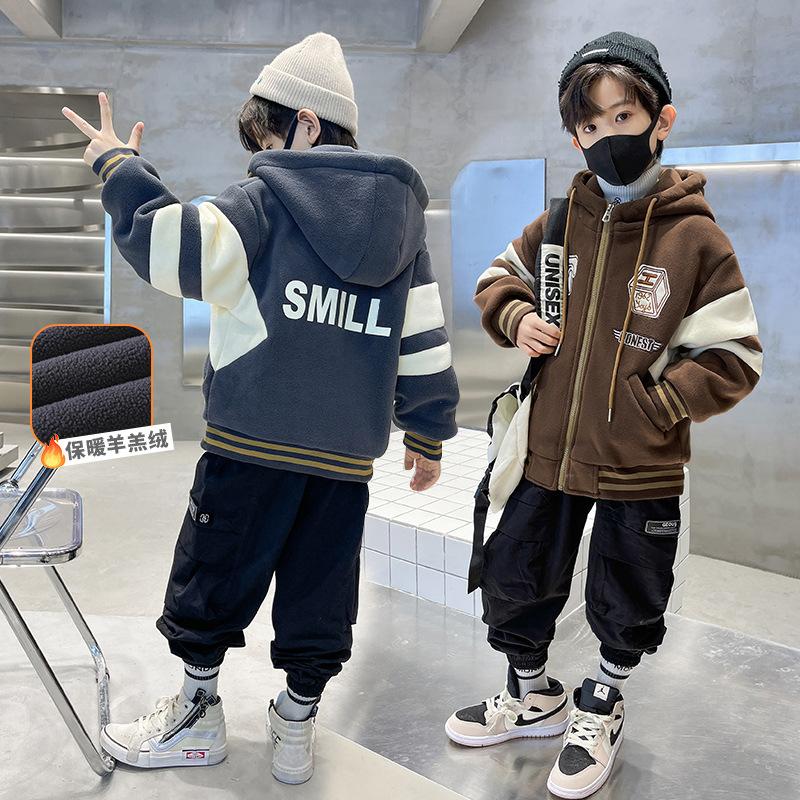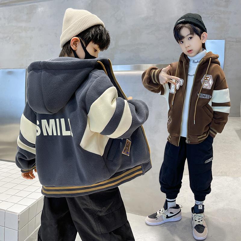 适用性别:男|产地:浙江|品牌:SF|货号:F连帽外套|货源类别:现货|适合年龄段:中大童(8岁以上,140cm以上)|领型:高领|适合季节:冬季|风格:韩版|图案:字母|厚薄:加厚|上市年份季节:2022年冬季|是否连帽:连帽|是否库存:否|元素:字母|袖长:长袖|AQL抽检标准:无|图片实拍:实拍有模特|安全等级:B类|毛头/杂余线头是否修剪:全部修剪干净|面料名称:化纤类混纺|里料成分:聚酯纤维(涤纶)|闭合款式:拉链衫|里料成分含量:85|平车针距12~14针/3cm:是|主面料成分:聚酯纤维(涤纶)|主面料成分含量:85|颜色:加绒加厚灰色,加绒加厚咖色|适合身高:120cm,130cm,140cm,150cm,160cm,170cm|是否跨境出口专供货源:是|主要销售地区:非洲,欧洲,南美,东南亚,北美,东北亚,中东,拉丁美洲,其他|衣长:短款|主要下游平台:ebay,亚马逊,wish,LINIO,SHEIN,速卖通,独立站,LAZADA,shopee,其他|有可授权的自有品牌:否|内胆类型:聚酯纤维内胆