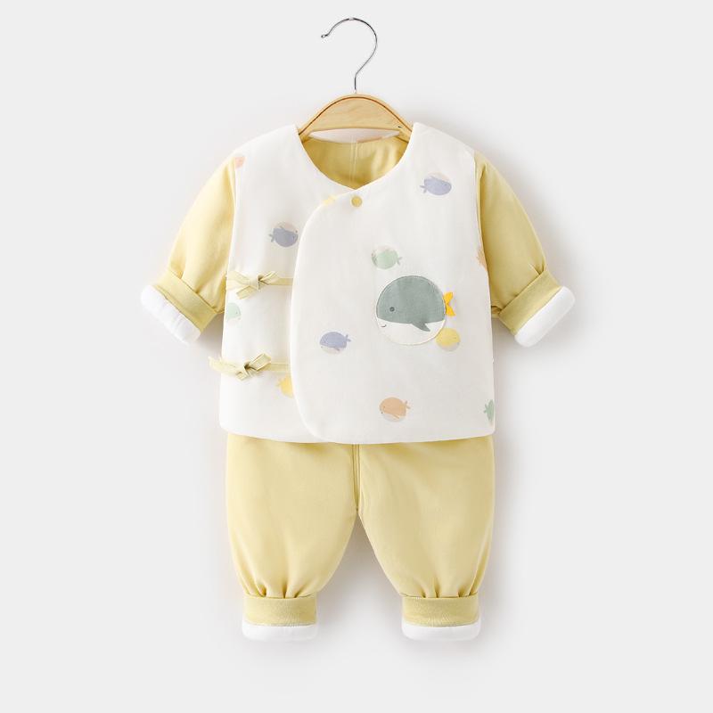 品牌:逗乐萌宝|货号:北极熊夹棉偏襟套装|货源类别:现货|适用性别:中性/男女均可|风格:休闲|产地:河南|适合年龄段:新生儿(0~1岁,80cm及其以下)|适合季节:冬季,秋季|面料工艺:柔软处理|填充物:聚酯纤维(涤纶)|是否连帽:不连帽|厚薄:加厚|图案:卡通|图片实拍:实拍无模特|是否库存:否|上市年份季节:2022年冬季|元素:卡通,可爱|AQL抽检标准:4.0|平车针距12~14针/3cm:是|毛头/杂余线头是否修剪:全部修剪干净|面料名称:棉|主面料成分:棉|主面料成分含量:100|里料成分:棉|里料成分含量:100|安全等级:A类|闭合款式:斜襟系带|领型:圆领|内胆类型:聚酯纤维内胆|颜色:北极熊蓝色,北极熊黄色,北极熊桔色,鲸鱼宝宝蓝色,鲸鱼宝宝黄色,鲸鱼宝宝桔色,鲸鱼宝宝杏色|适合身高:59#【新生儿】,66#【1-3个月】|是否跨境出口专供货源:否|是否IP授权:否