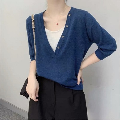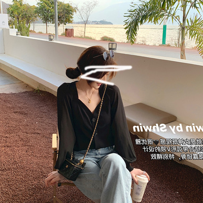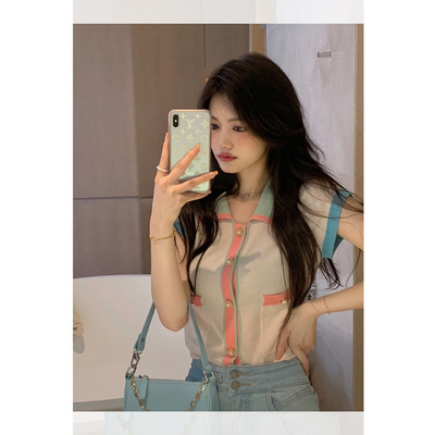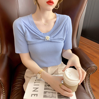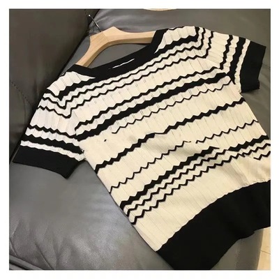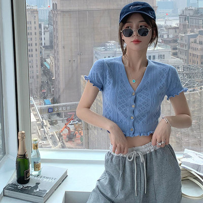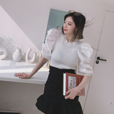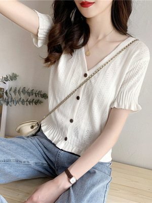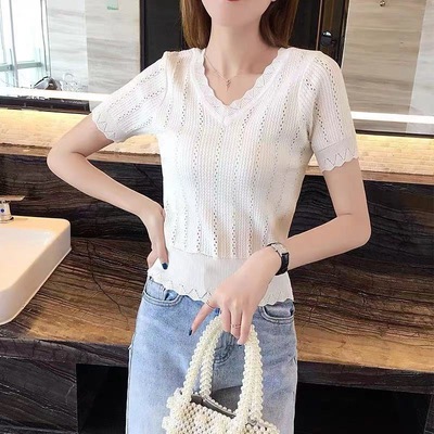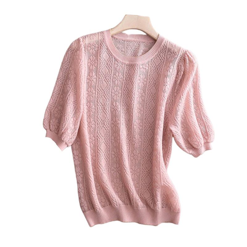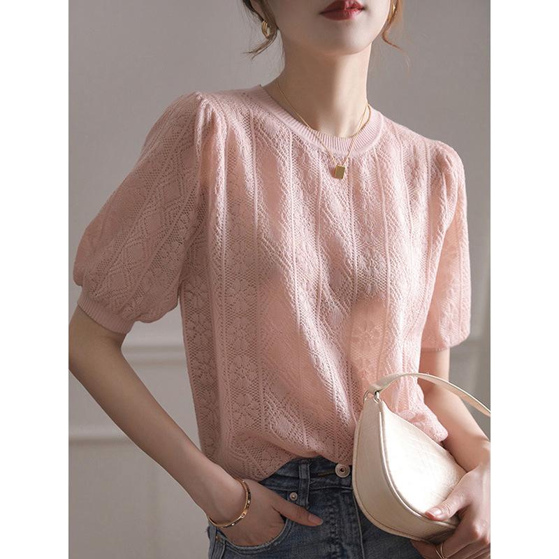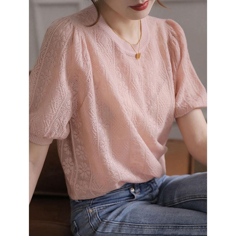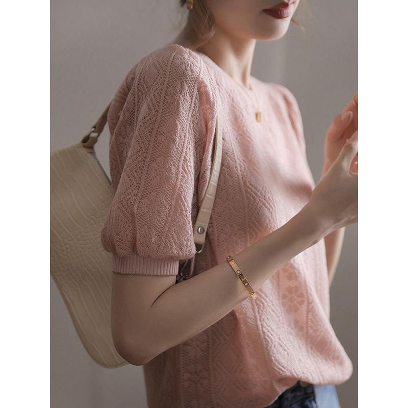 厂家直销法式复古泡泡袖冰丝针织衫女装春夏新款镂空短袖上衣小衫 |