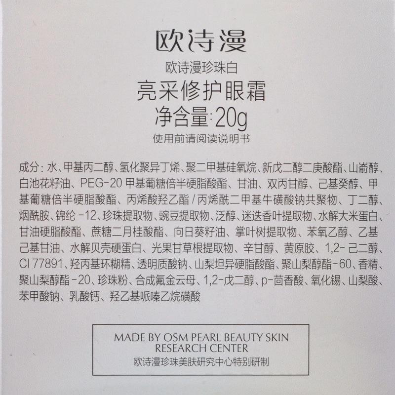特殊用途化妆品证号:国妆特字G20180424|适用肤质:通用|产地:中国|特殊用途化妆品:是|保质期:3年|规格:正常规格|净含量:20g|是否进口:否|品牌:欧诗漫|化妆品功效:改善黑眼圈|货号:欧诗漫|是否跨境出口专供货源:否|品牌类型:国货品牌|生产许可证号:浙妆20160027|适用人群:通用|产品名称:欧诗漫珍珠白亮采修护眼霜
