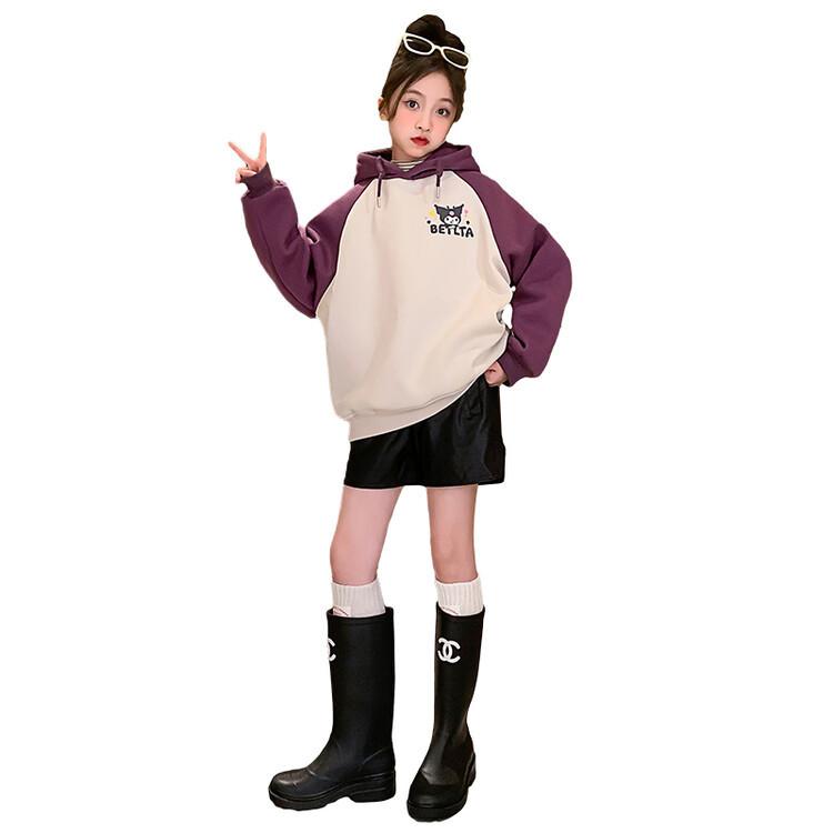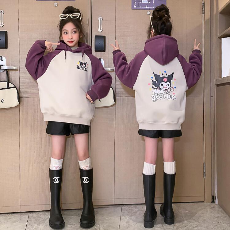 品牌:果果家|货号:YFTS&0562|货源类别:现货|适用性别:女|风格:韩版|产地:浙江|适合年龄段:中大童(8岁以上,140cm以上)|适合季节:冬季,秋季|面料工艺:柔软处理|图案:卡通|厚薄:加厚|袖长:长袖|闭合款式:套头衫|是否连帽:有帽不可拆|图片实拍:实拍有模特|是否库存:是|元素:卡通|上市年份季节:2023年秋季|AQL抽检标准:2.5|平车针距12~14针/3cm:是|毛头/杂余线头是否修剪:全部修剪干净|面料名称:棉|主面料成分:棉|主面料成分含量:86|安全等级:B类|内胆类型:聚酯纤维内胆|颜色:紫色,黑色|适合身高:120cm,130cm,140cm,150cm,160cm,170cm|主要下游平台:ebay,亚马逊,wish,速卖通,独立站,LAZADA,其他|主要销售地区:非洲,欧洲,南美,东南亚,北美,东北亚,中东,其他|有可授权的自有品牌:是|是否跨境出口专供货源:是