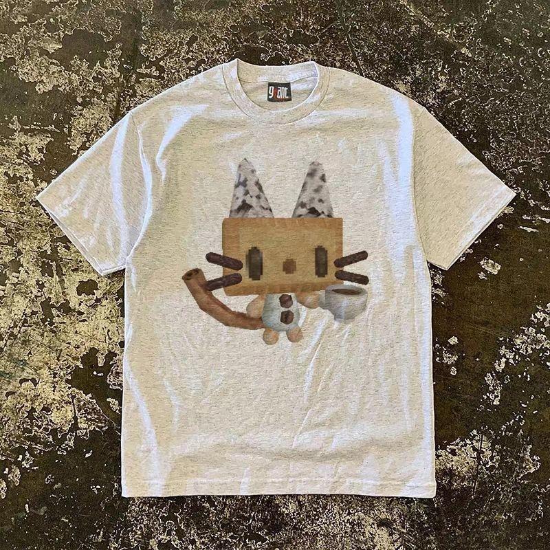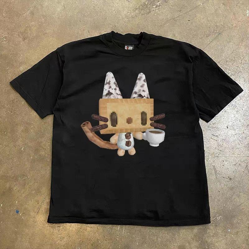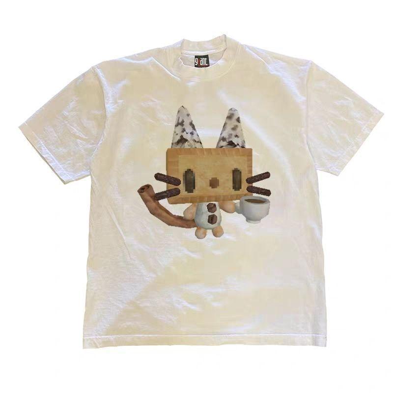 美式hiphop咖啡猫咪创意夏季多巴胺男女同款短袖T恤ins慵懒风上衣