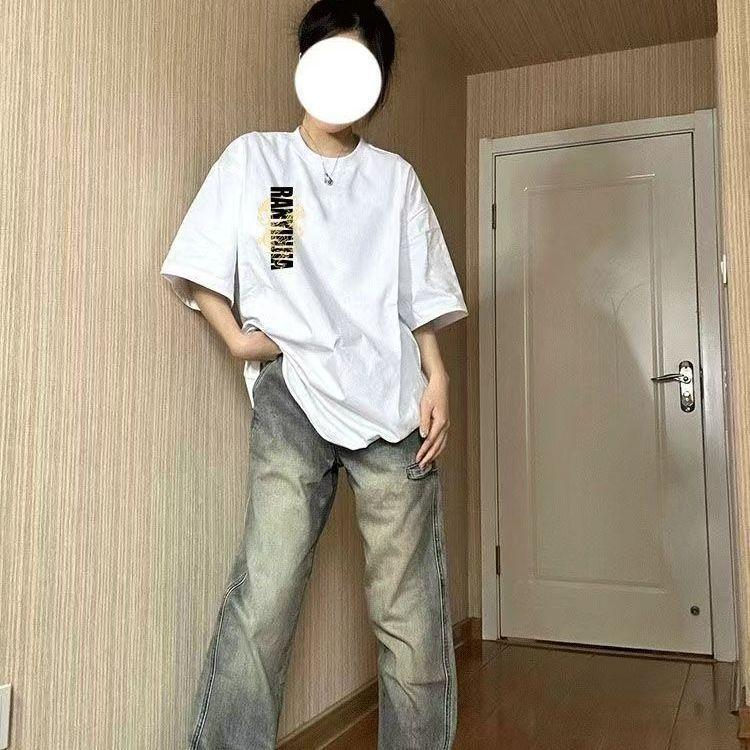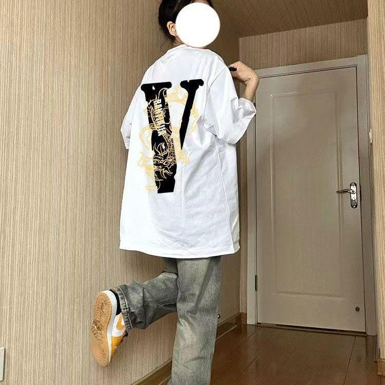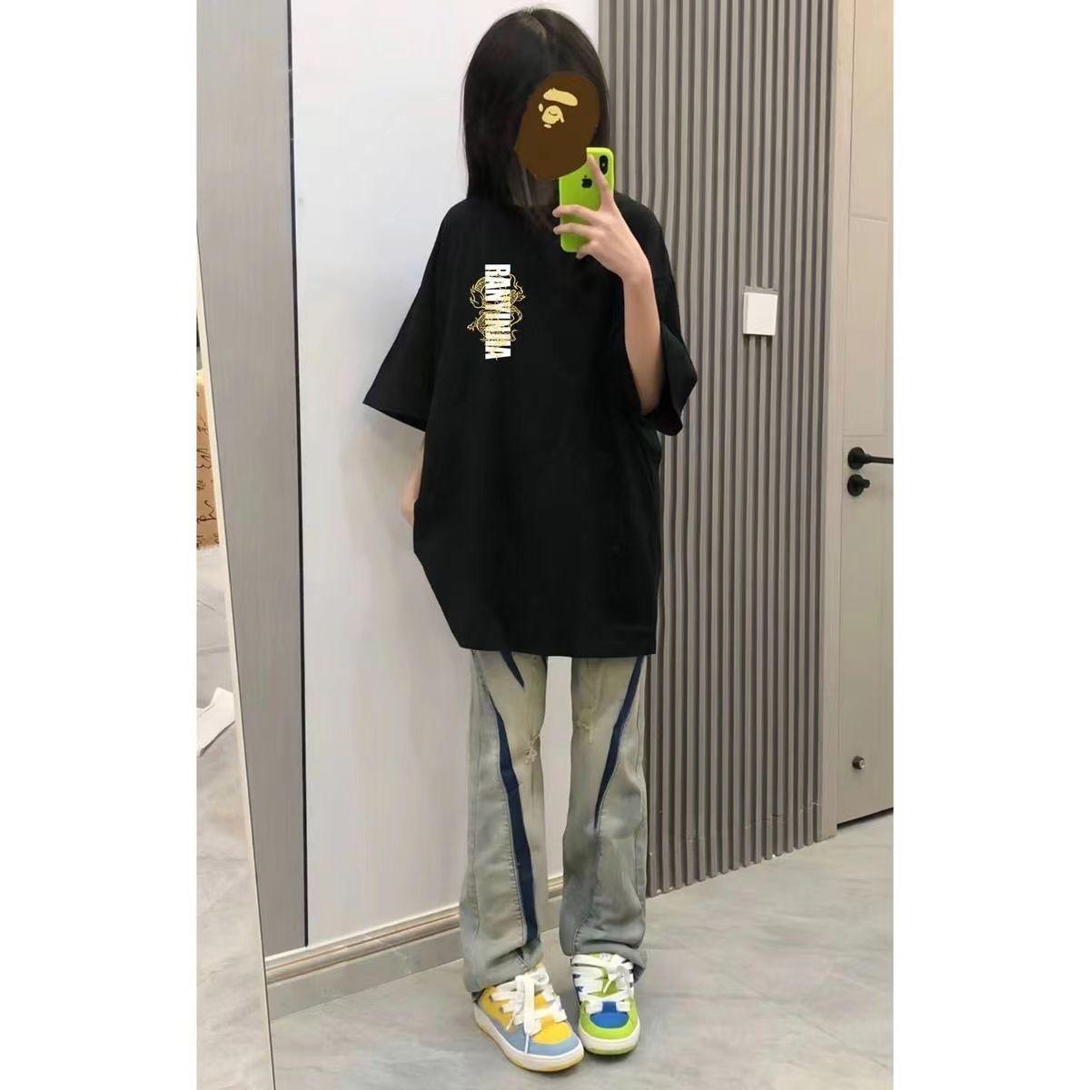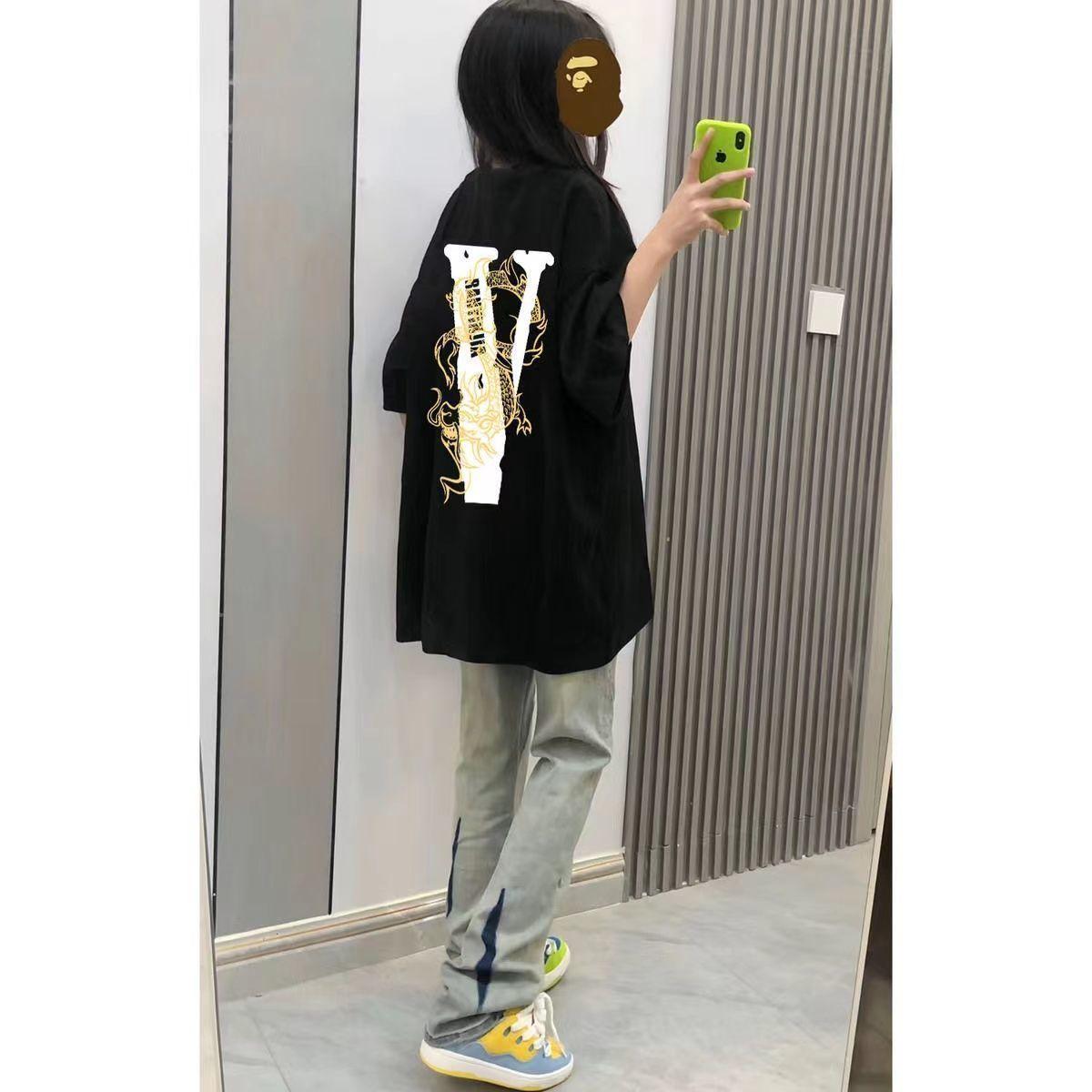 重磅国潮短袖t恤女中长款校园风v字母龙纹印花高街嘻哈ins风上衣