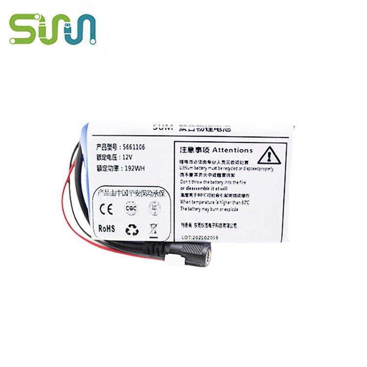 品牌:杉茂\/SUM|标称容量:16000mAh|产品型号:5661106|标称电压:12V|充电温度:0-45℃|放电温度:-10~80℃|产品净重:320g|外型尺寸:18*65*110(mm)|检测标准:BG31214 \ IEC62133|应用领域:电子锁定位、停车位、按摩仪、美容仪|是否定制:是|产地:东莞|是否进口:否|可售卖地:全国|类型:三元锂电池