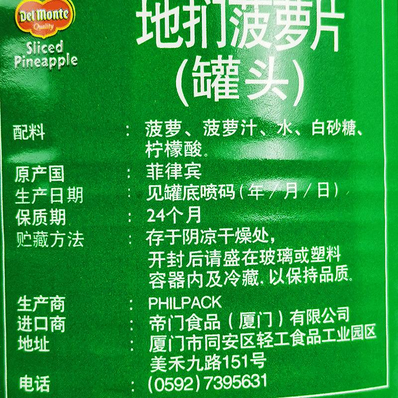 商品条形码:8887333150129|是否进口:否|原产地:广东|产品类别:菠萝罐头|保质期:24个月|品牌:地扪|净含量(规格):836g*24罐|生产厂家:帝门食品(厦门)有限公司|原料与配料:菠萝、菠萝汁、水、白砂糖、柠檬酸|生产日期:2019.11.11|储藏方法:存于阴凉干燥处,开封后请盛在玻璃或塑料容器内及冷藏|生产许可证编号:SC12444011301019|货号:地扪菠萝片(绿)|包装规格:地扪菠萝片836g*24罐|供货时间:全年|是否礼盒装:否|储存条件:常温|制作工艺:咨询客服|产品认证:否