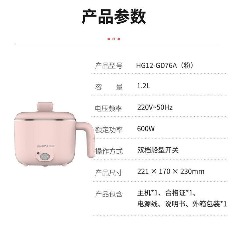 类型:电热/火锅|功率:600w|电热/火锅功能:蒸,炒,炸,煎,煮,炖,火锅|机身材质:铝合金|容量:6L|内锅深度:8cm|颜色:粉色|适用人数:1人-2人|附加功能:10010|包装清单:见详情|加工方式:贴牌加工|内胆材质:图层|智能类型:不支持智能|上市时间:2021秋|产地:中国|货源类别:现货|操控方式:机械式|额定电压:220V|产品尺寸:见详情|产品重量:3|3C证书编号:2018010717110702|售后服务:全国联保|货号:HG12-GD76A|是否跨境出口专供货源:否|是否专利货源:否|外壳工艺:见详情|特色服务:无|产品规格:HG12-GD76A|锅口规格:20cm及以下,21cm(含)-25cm(含)|品牌:Joyoung/九阳