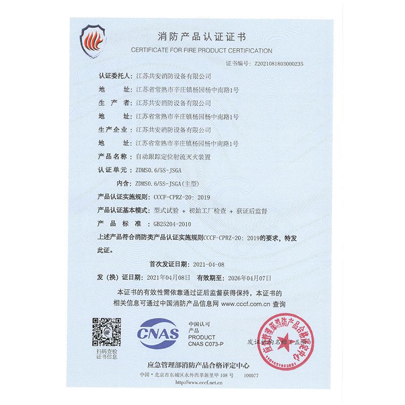 是否进口:否|品牌:江苏共安消防|型号:ZDMS0.6/5S-JSGA|类型:消防炮|灭火剂类型:水灭火系统|3C证书编号:2019081801001250|规格:ZDMS0.25/2S-JSGA,ZDMS0.6/3S-JSGA,ZDMS0.6/5S-JSGA,ZDMS0.6/10S-JSGA,ZDMS0.8/20S-JSGA,ZDMS0.8/30S-JSGA,DCF-DN50,KZX208-JSGA,JMX308-JSGA|是否进口:否|品牌:江苏共安消防|型号:ZDMS0.6/5S-JSGA|类型:消防炮|灭火剂类型:水灭火系统|3C证书编号:2019081801001250|规格:ZDMS0.25/2S-JSGA,ZDMS0.6/3S-JSGA,ZDMS0.6/5S-JSGA,ZDMS0.6/10S-JSGA,ZDMS0.8/20S-JSGA,ZDMS0.8/30S-JSGA,DCF-DN50,KZX208-JSGA,JMX308-JSGA