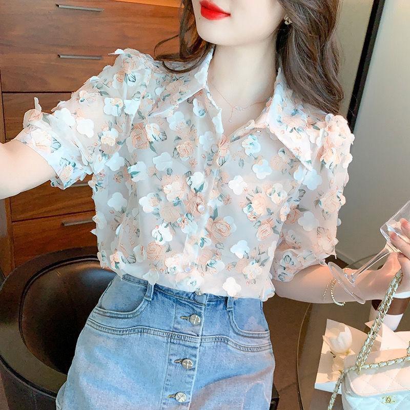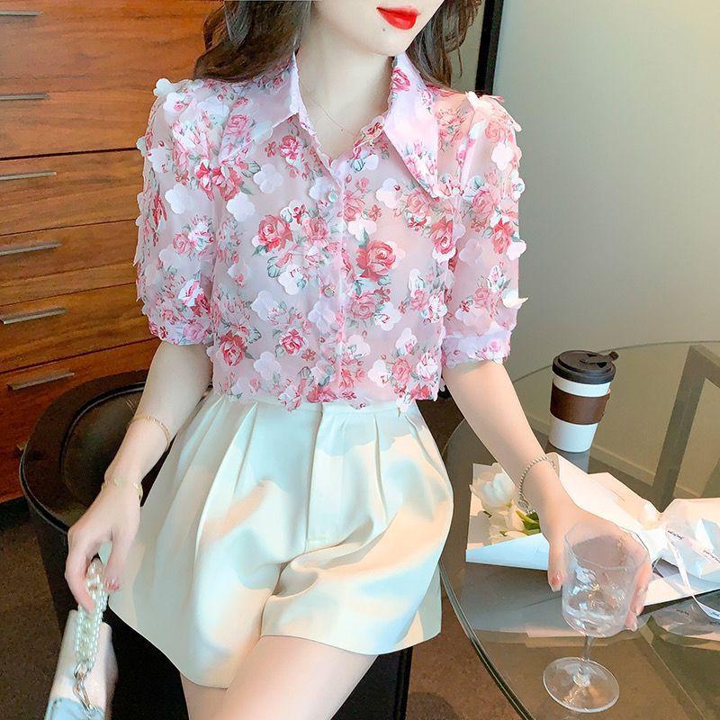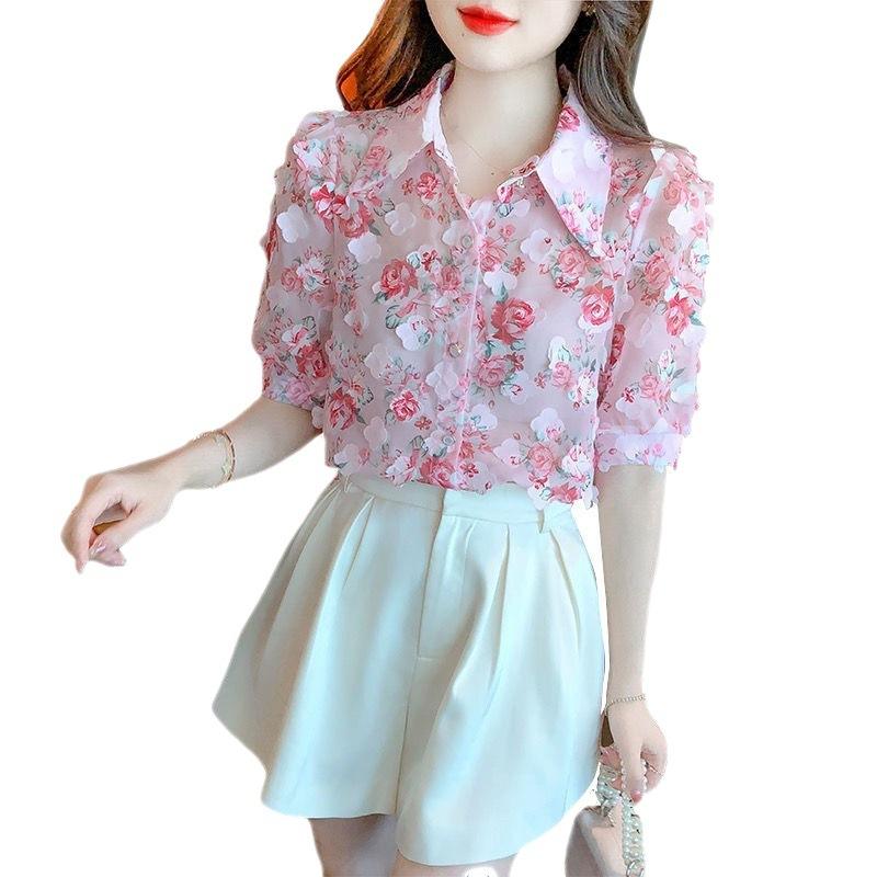 印花立体花朵雪纺衬衫女2023夏季时尚新款翻领显气质百搭显瘦上衣 |