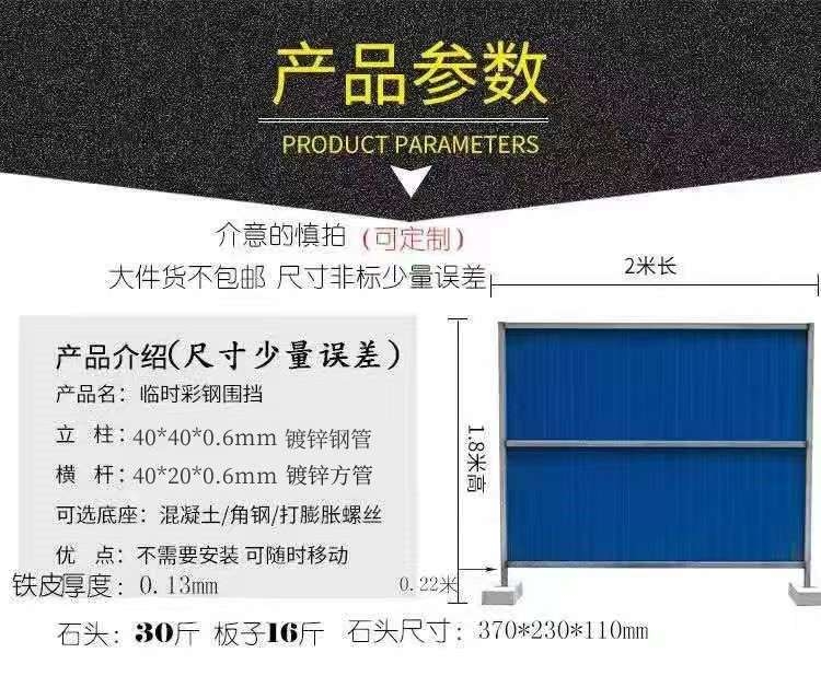 【商品介绍】可移动彩钢围挡也称为简易围挡、铁皮围挡、临时活动围挡 【商品特点】重复使用,安装方式灵活多变,随移随走,方便快捷 【注意事项】经常反复挪用拆装易变形,使用寿命一年 【物流服务】24小时内发货,大件物品发物流或专车,支持自提 【价格说明】由于产品原材料变化容易影响产品价格,所以标记为市场价格,不是真正价格(拍之前请联系客服) 【售后须知】全款发货,不支持退货 备注:常规款(石头底座,一块板子配一块石头),不同底座价格不同。支持定制! |