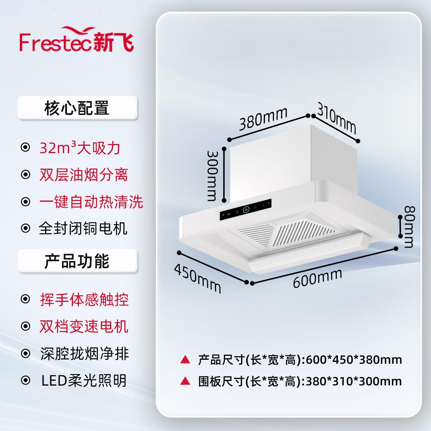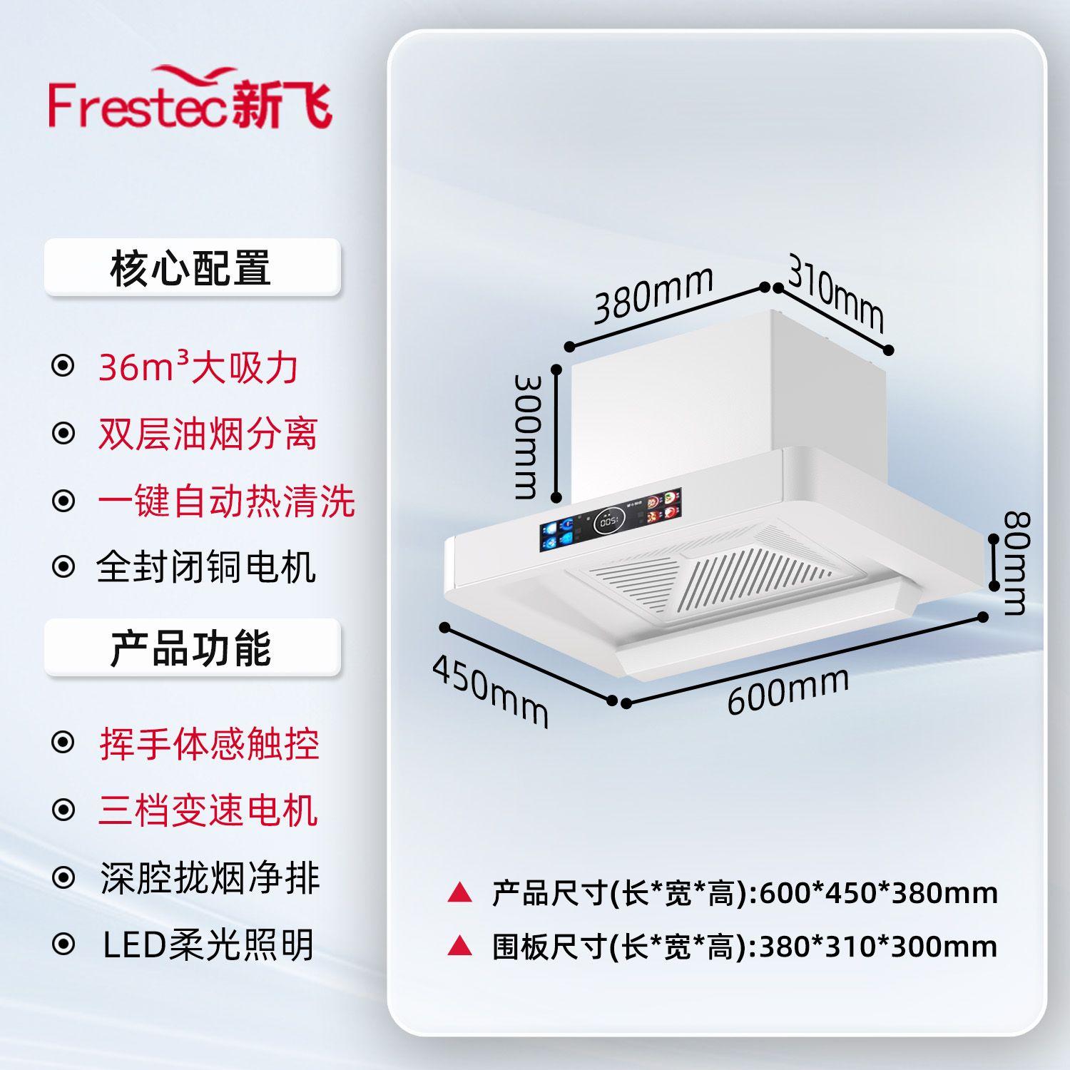 品牌:[FRESTECH/新飞]|型号:[CXW-160-TMO5]|产地:[中国大陆]|油烟机类型:[家用]|3C认证证书编号:[2024180716061365]|按键类型:[触控式]|控制面板材质:[钢化玻璃]|是否支持智能:[不支持]|机身材质:[喷涂钢板]|油烟机烟机安装位置:[顶吸式]|油烟机种类:[欧式]|油烟机排风量:[36m³/min]|能效等级:[一级]|宽:[500mm]|厚:[450mm]|高:[380mm]|噪音:[56dB]|拢烟罩结构:[浅罩型]|认证标准和技术要求:[GB4706.1-2005,GB4706.28-2008]|生产者(制造商)名称:[中山市新新电器有限公司]