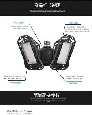 货源类别产地:深圳观澜|是否进口:否|订货号:CK-04-80W|品牌:聚星辉|货号:CK-04-80W|型号:CK-04|光源类型:2835/1W|光源功率:三叶CK-01-60W,三叶CK-01-80w,三叶CK-01-90w,三叶CK-01-130w,三叶CK-02-60w(感应款),三叶CK-02-80w(感应款),四叶CK-04-80w,四叶CK-04-120w|灯罩型式:可变形LED灯|光源颜色:正白|光通量:5000lm(lm)|工作电压:AC90-265V(V)|灯头规格:E27|主要适用范围:车库、工地、室内照明、应急照明灯|主要下游平台:ebay,亚马逊,wish,速卖通,独立站,LAZADA|主要销售地区:非洲,欧洲,南美,东南亚,北美,东北亚,中东|有可授权的自有品牌:是|是否跨境出口专供货源:是|规格:黑色|是否一般纳税人:是|认证:CE|专利类型:外观设计专利|是否有专利:是|专利号:2019214775121|类型:CK-04|名称:金属款四叶车库灯。