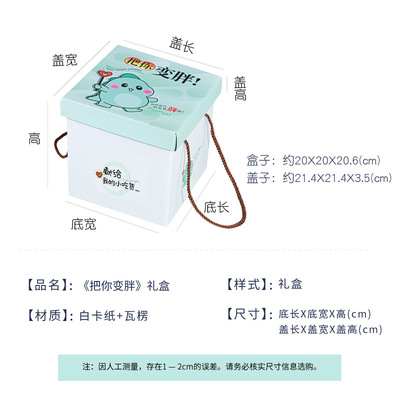 产地:潮州|是否进口:否|供货类型:可定制|加工定制:是|加印LOGO:可以|用途:通用包装|纸盒类型:折叠纸盒|纸张克重:250gsm|工艺:胶印|自重:200g|日生产量:100000|品牌:大画彩印|货号:2105 把你变胖|是否现货:是|纸(板)材质:2105 把你变胖|是否跨境出口专供货源:否|误差:0.1-0.5|尺寸:21.5*21.5*21cm|内径:外径-0.5
