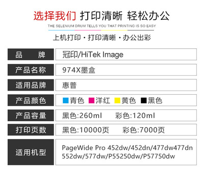 货源类别品牌:冠印/Hitek lamge|货号:974a|型号:974a|适用品牌型号:惠普 Pagewide 352dw/377dw/P55250dw/P57750dw|填充性:不可填充|售后类型:店铺三包|类型:兼容|对应原装型号:hp974a|是否进口:否|颜色:黑色974A墨盒3500页,红色974A墨盒3000页,黄色974A墨盒3000页,蓝色974A墨盒3000页,黑色974X10000页,红色974X墨盒7000页,蓝色974X墨盒7000页,黄色974X墨盒7000页|主要下游平台:ebay,亚马逊,wish,速卖通,独立站,LAZADA|主要销售地区:非洲,欧洲,南美,东南亚,北美,东北亚,中东|有可授权的自有品牌:是|是否跨境出口专供货源:是|产品类别:墨盒。