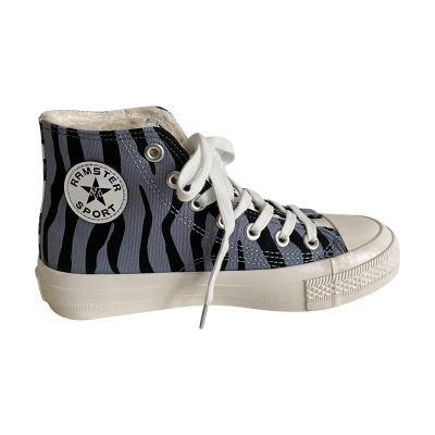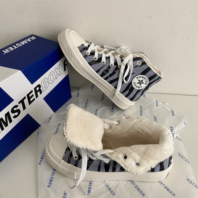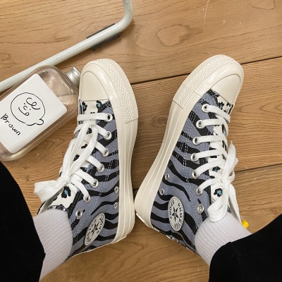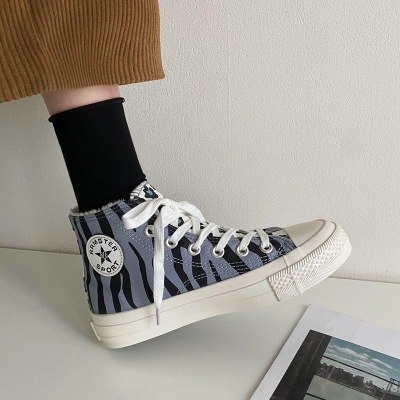 2020新款条纹百搭高帮ins风街拍女网红同款雾霾蓝豹纹帆布鞋女