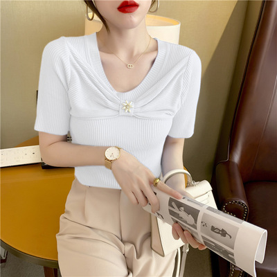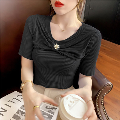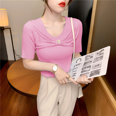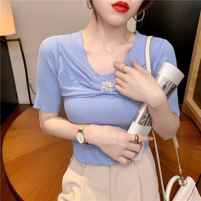 冰丝针织衫女短袖t恤夏季2021年新款半袖修身显瘦圆领别致上衣薄 |