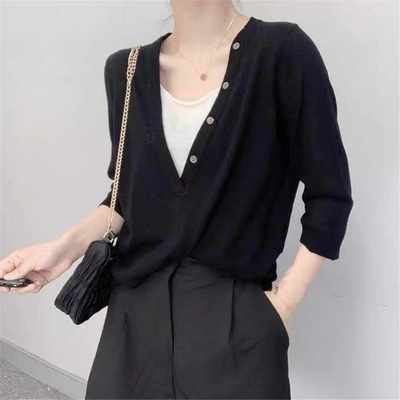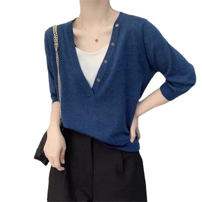 2021春夏新款V领扣子装饰宽松防晒七分袖毛衣假两件针织衫女潮ins |
