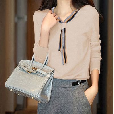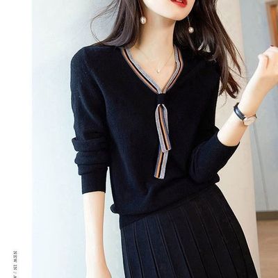 针织衫女长袖2021春秋季新款减龄撞色打底衫洋气毛衣飘带V领上衣 |