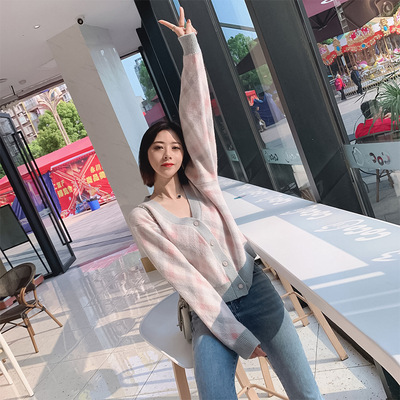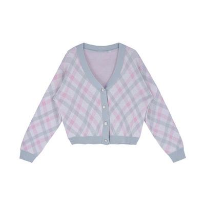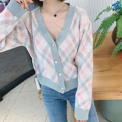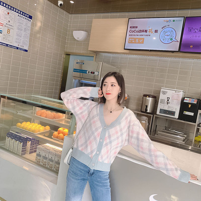 2021春秋季新款韩版宽松显瘦开衫格纹单排扣V领毛针织衫女装批发 |